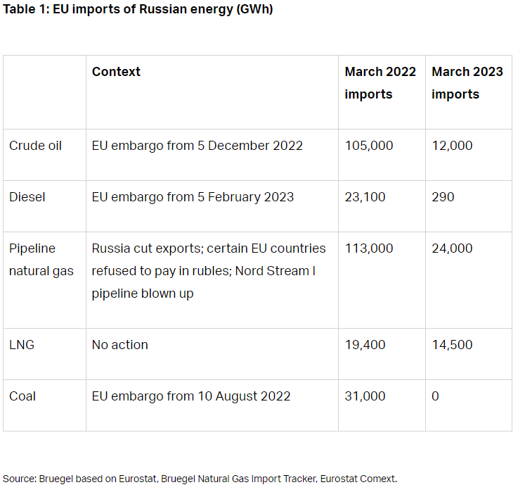 يهدف الاتحاد الأوروبي إلى القضاء على جميع واردات الوقود الأحفوري الروسي بحلول عام 2027. وقد تم إحراز تقدم سريع، بمساعدة قرار روسيا بتقليص صادرات خطوط أنابيب الغاز الطبيعي إلى الاتحاد الأوروبي. ومع ذلك، ظلت واردات الاتحاد الأوروبي من الغاز الطبيعي المسال من روسيا مستقرة بشكل ملحوظ. المناقشات جارية حول إضافة الغاز الطبيعي المسال الروسي إلى قائمة المنتجات المحظور استيرادها إلى الاتحاد الأوروبي (الجدول 1). طوال عام 2022، قطعت روسيا صادراتها من خطوط أنابيب الغاز الطبيعي إلى الاتحاد الأوروبي بشكل مطرد، لكنها لم تقلل صادرات الغاز الطبيعي المسال، التي كانت أصغر بكثير من حيث الحجم. في العام الذي أعقب الغزو الروسي لأوكرانيا، بلغت قيمة صادرات الغاز الطبيعي المسال إلى الاتحاد الأوروبي 12 مليار يورو. ما لم يكن هناك تغيير حاسم من الوضع الحالي، يمكن أن يدفع الاتحاد الأوروبي ما يصل إلى 9 مليارات يورو أخرى لروسيا في السنة الثانية من الحرب (Demertzis and McWilliams، 2023).