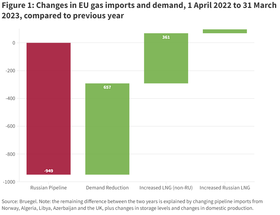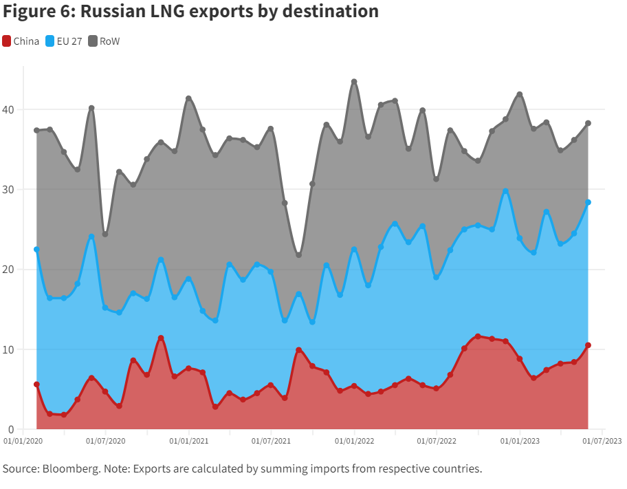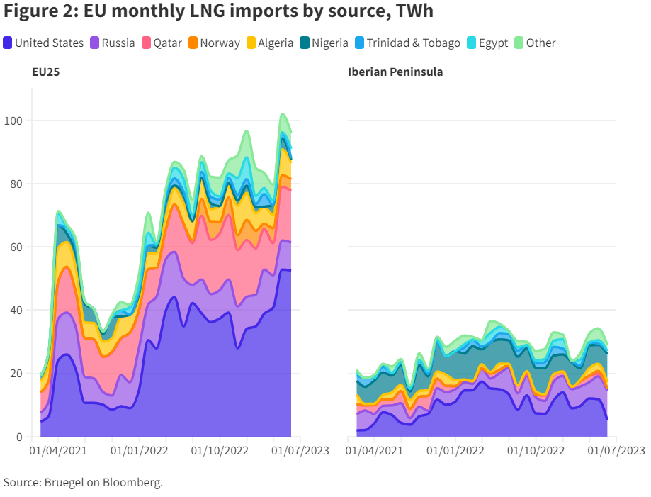 A lo largo de 2022, Rusia redujo constantemente las exportaciones de gas natural por gasoducto a la UE, pero no redujo las exportaciones de GNL, cuyo volumen había sido mucho menor. En el año posterior a la invasión rusa de Ucrania, las exportaciones de GNL a la UE se valoraron en 12.000 millones de euros. A menos que se produzca un cambio decisivo respecto a la situación actual, la UE podría pagar hasta otros 9.000 millones de euros a Rusia en el segundo año de la guerra (Demertzis y McWilliams, 2023).