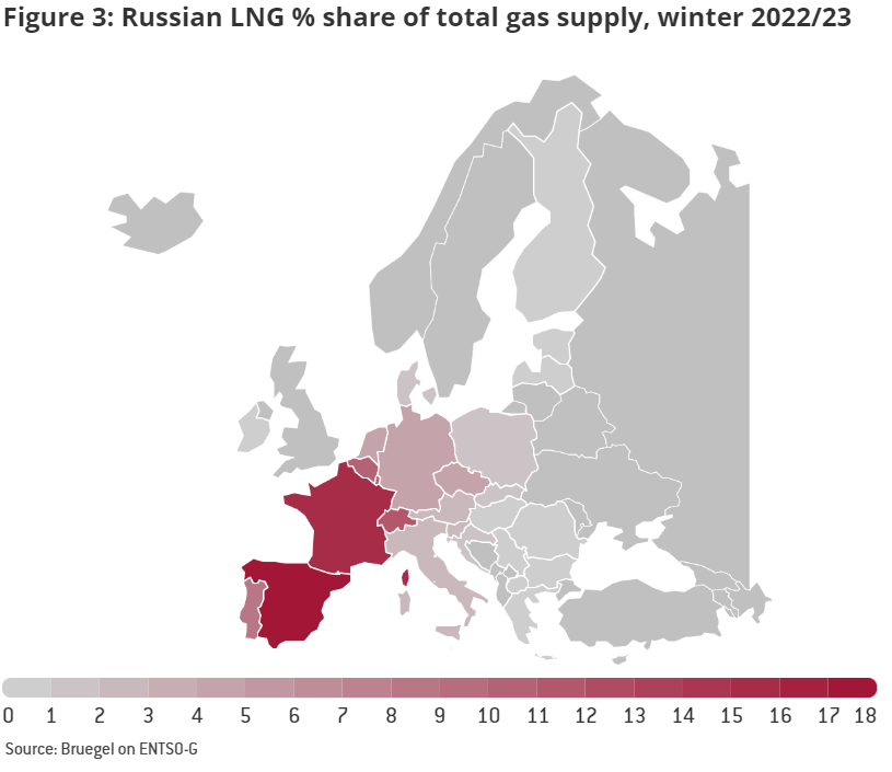 Por su naturaleza, las importaciones de GNL pasan por los puertos antes de distribuirse por la red de gas europea. Las importaciones de GNL de un país no se quedan necesariamente allí, sino que pueden transitar hacia países vecinos. La información contractual sobre estos flujos no está disponible públicamente, pero hemos estimado la importancia relativa del GNL ruso por país. La figura 3 muestra estos resultados para el invierno 2022-2023. Según nuestra base contable, el GNL ruso representó el 18% del suministro de gas español, el 15% del francés y el 10% del belga.