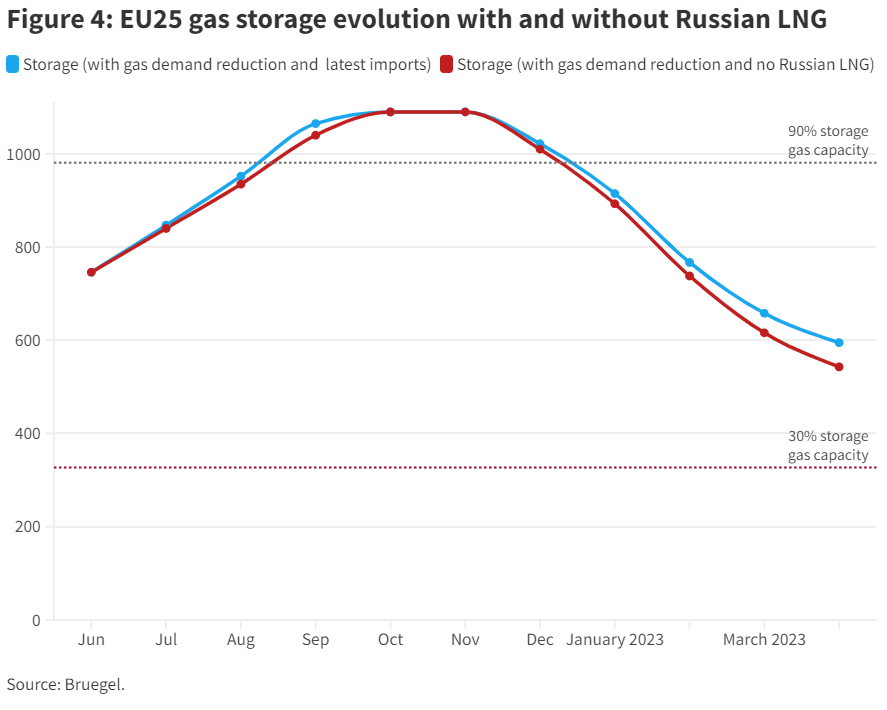 El gráfico 4 muestra que la UE-25 podrá llenar las instalaciones de almacenamiento durante los meses de verano sin GNL ruso, con la única consecuencia de un ligero aplazamiento del momento en que el almacenamiento alcance su plena capacidad. Aunque los volúmenes almacenados se agotarán a un ritmo marginalmente más rápido, la UE-25 tampoco se enfrentará a un reto adicional sustancial para gestionar el invierno de 2023-24.
