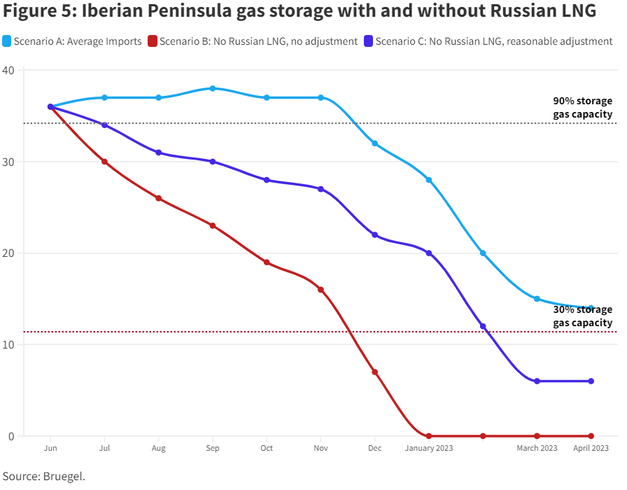 Por tanto, mientras que la UE-25 se las arreglaría cómodamente sin el GNL ruso, la situación en la Península Ibérica dependería de la capacidad de encontrar suministros alternativos de GNL. Al comercializarse por mar, los cargamentos de GNL son en cierto modo fungibles. Si el GNL ruso deja de fluir hacia la UE, Rusia buscará vender este GNL en otros lugares al mismo tiempo que los compradores de la UE buscan un suministro alternativo. En teoría, el mercado mundial debería reequilibrarse con una capa adicional de fricción causada por rutas comerciales menos eficientes. Esto sería similar al impacto del embargo de crudo ruso por parte de la UE (McWilliams et al, 2022).