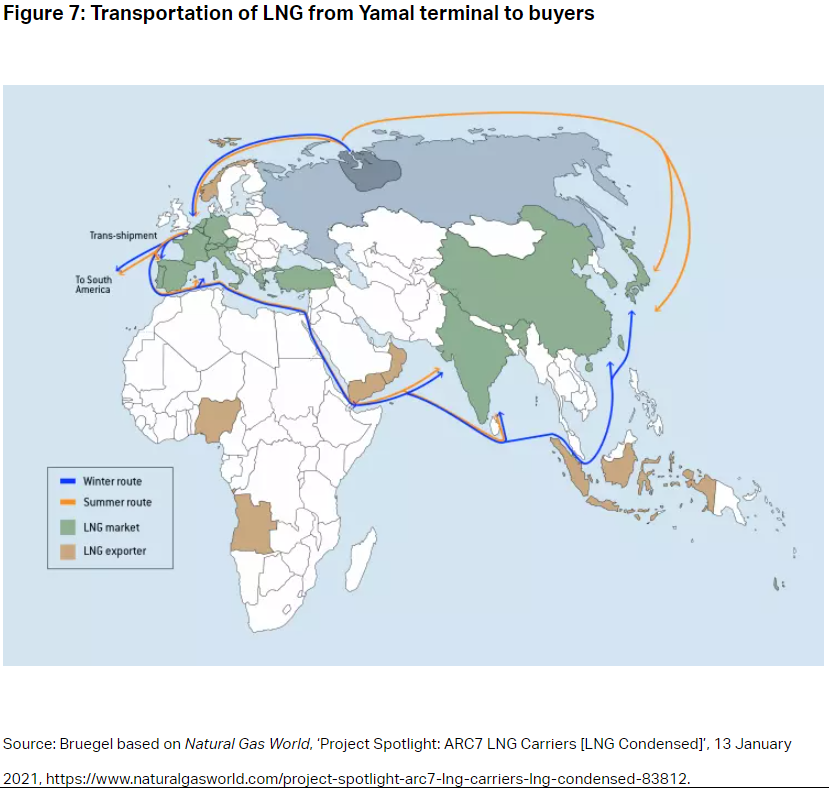 Una peculiaridad es la ruta comercial que debe seguir un buque metanero ruso. Gran parte de la demanda europea de GNL se abastece en las plantas de GNL de la península de Yamal, en la costa noroccidental de Siberia. En los meses de verano, los buques viajan hacia el este, a los mercados asiáticos, donde puede haber demanda para los cargamentos que ya no van a la UE. Sin embargo, durante el invierno boreal -cuando la demanda de GNL suele ser mayor- no suele ser posible atravesar el Círculo Polar Ártico. Los buques de GNL tendrían que emprender una ruta considerablemente más larga a través del Canal de Suez, con costes más elevados.
