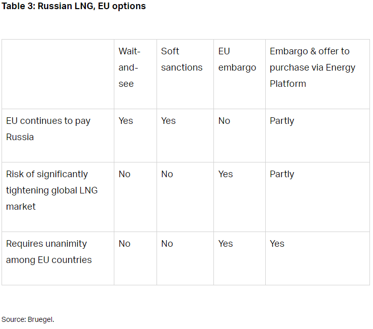 Un enfoque alternativo, embargo de la UE con oferta de la Plataforma de la Energía, podría verse facilitado por la nueva Plataforma de la Energía de la UE. La plataforma se puso en marcha en abril de 2022 como mecanismo de compra conjunta para la UE. En la primera licitación, 63 empresas presentaron solicitudes por un volumen total de 120 TWh de gas natural. La plataforma sería adecuada como vehículo de la UE para coordinar las compras de GNL ruso. Tras rescindir los contratos a largo plazo existentes con Yamal LNG, la UE en bloque podría entonces ofrecer la compra de GNL ruso a un precio inferior al de mercado, que podría revisarse en función de la evolución de la situación en Ucrania.