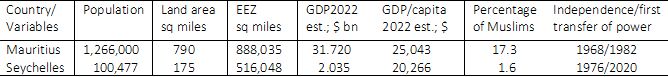 Маврикий и Сейшелы — два небольших островных государства в юго-западной части Индийского океана. Оба они являются бывшими британскими колониями и с момента обретения независимости являются членами Британского Содружества. Обе страны входят в число самых процветающих африканских стран со стабильными демократическими правительствами, высоким уровнем общественной безопасности, круглогодичным теплым климатом и необыкновенной природной красотой. Они могут похвастаться самыми высокими рейтингами в Индексе человеческого развития Организации Объединенных Наций среди стран Африки к югу от Сахары (Маврикий 63-е место, Сейшельские Острова 72-е место из 191 страны в общем рейтинге, а Южная Африка занимает 109-е место).