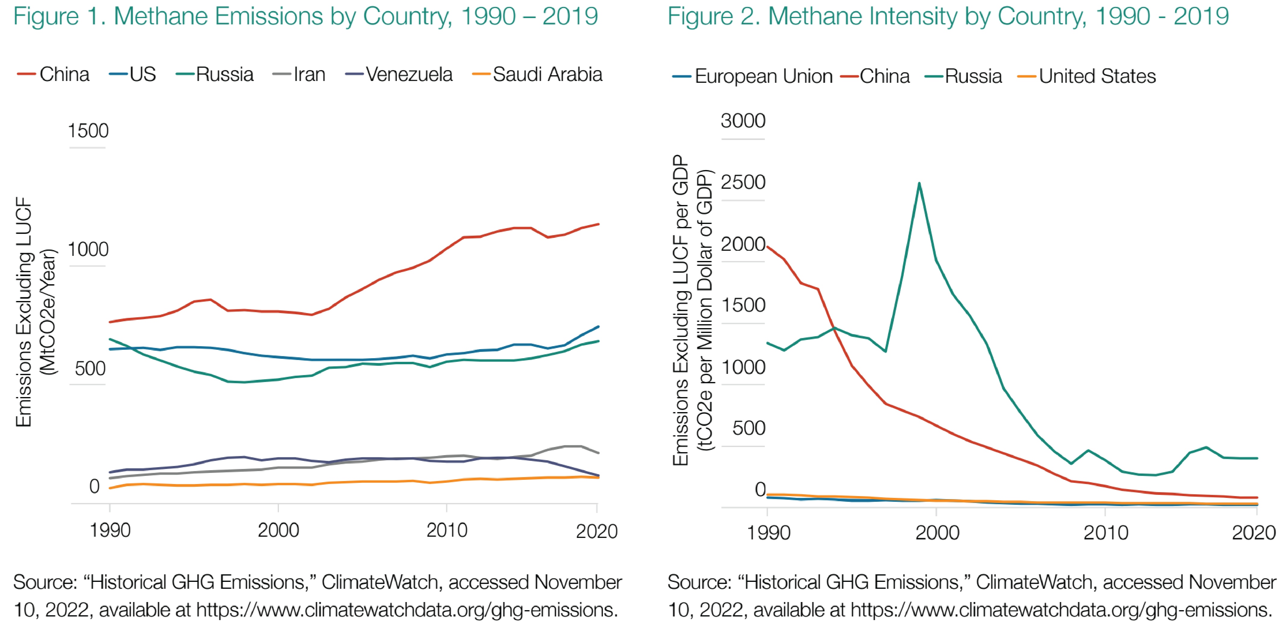 Abbildung 1 zeigt einige der weltweit größten Emittenten von Methan, das als Treibhausgas 80-mal wirksamer ist als Kohlendioxid (CO2). Nach Angaben des Environmental Defense Fund ist Methan für etwa 25 Prozent der heutigen globalen Erwärmung verantwortlich. Russland, Iran und Venezuela gehören zu den weltweiten Spitzenreitern in diesem Wettlauf nach unten, obwohl die viel größeren Volkswirtschaften der USA, Europas und Chinas mehr von diesem Gas produzieren. Abbildung 2 zeigt, dass die USA, gemessen an der Methanintensität, etwa 35 Tonnen CO2-Äquivalent an Methan pro Million Dollar BIP ausstoßen. Die entsprechende Zahl für Russland beträgt 404, für den Iran 733, für Saudi-Arabien 137 und für Venezuela 1.864.