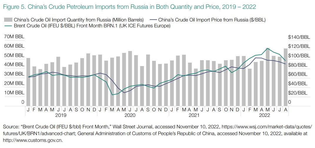 China produziert heute etwa 750 Tonnen CO2 pro Million Dollar BIP, verglichen mit 225 in den USA und 174 in der EU. China ist bei weitem der größte CO2-Produzent der Welt und hat einen höheren Ausstoß an Treibhausgasen als alle Mitglieder der Organisation für wirtschaftliche Zusammenarbeit und Entwicklung zusammen (siehe Abbildung 4). In dieser Messung sind die Emissionen nicht enthalten, die nach der Fertigstellung von 94 Tausend Megawatt (MW) neuer kohlebefeuerter Stromerzeugungskapazitäten, die sich derzeit im Bau befinden, oder den 196 Tausend MW bereits genehmigter neuer Kapazitäten entstehen werden. China ist kein großer Öl- und Gasproduzent, hat aber eine 30-prozentige Überkapazität in der Ölraffination aufgebaut und importiert große und wachsende Mengen Rohöl aus Russland, Venezuela und dem Iran zu günstigen Preisen. Abbildung 5 zeigt aktuelle Daten aus den chinesischen Zollstatistiken zu Umfang und Preis der Rohölimporte aus Russland.