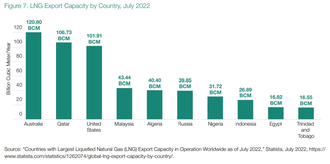 Australien war im Jahr 2021 der größte LNG-Exporteur, lieferte aber in diesem Jahr nur 0,037 Mrd. bcm direkt nach Europa. Australien hat derzeit keine Pläne, seine Exportkapazitäten zu erweitern, und die Innenpolitik hat sich ohnehin gegen neue Exporte gewandt.