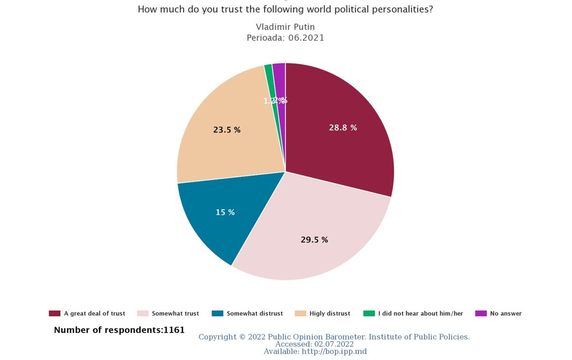 La percepción de popularidad, la cual ha sido creada usando los recursos de los medios de comunicación y tecnologías RP le dan puntos de confianza adicionales entre la población rusa alrededor del mundo. El nivel de confianza en Vladímir Putin en Rusia es muy alto, un 77%. De acuerdo con las fechas del Barómetro de Opinión Pública del Instituto de Políticas Públicas de Moldavia, se tenía una gran confianza en Vladímir Putin en el 2021, un 28.8% de los encuestados moldovos.
