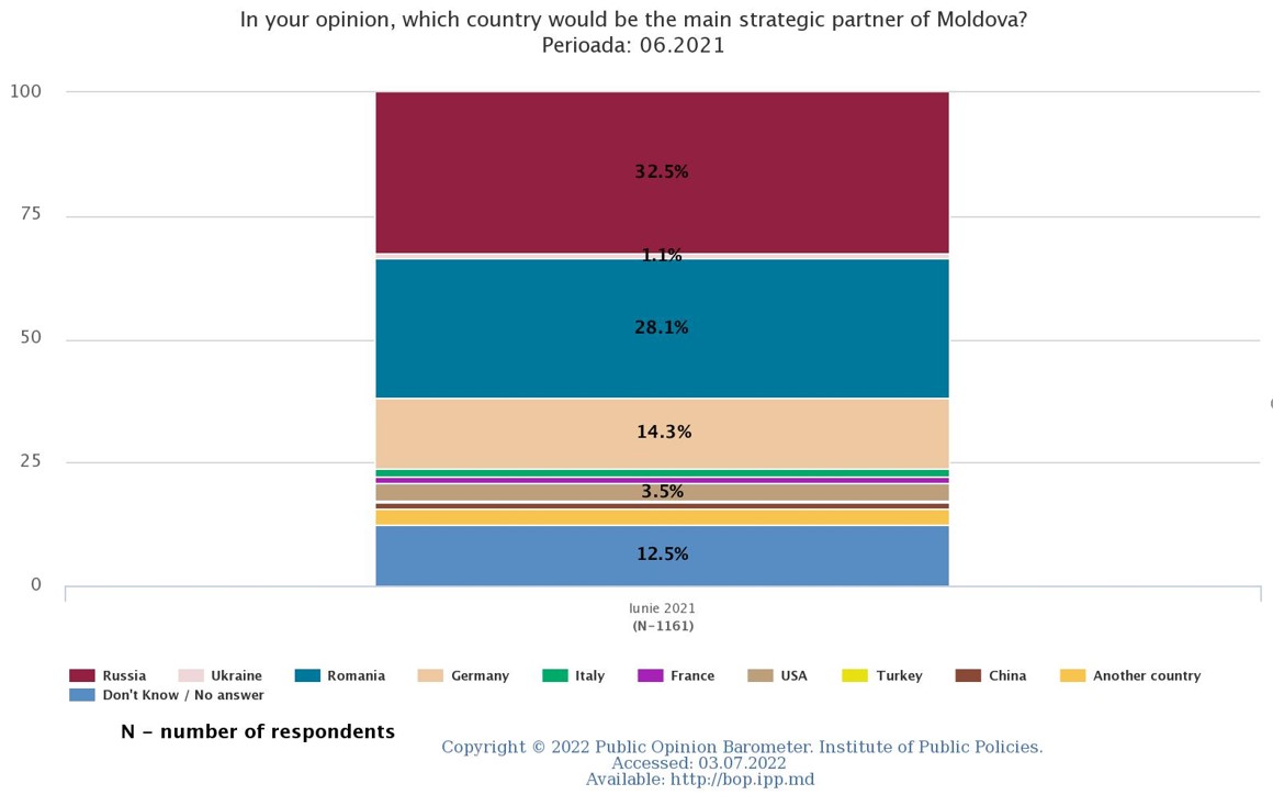 A pesar de la trayectoria de integración europea y la considerable ayuda recibida en este proceso de la vecina Rumania, el principal socio estratégico de Moldavia, a mediados del 2021, 32.5% de los encuestados percibieron que era Rusia, y 28.1% Rumania.
