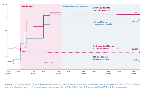 Chad Bowen (2023) vom Peterson Institute for International Economics stellte die Frage, ob sich der Handelskrieg zwischen den USA und China für die US-Exporteure gelohnt hat. Seine Antwort lautet bisher: Nein. Mitten im Handelskrieg unterzeichneten die Vereinigten Staaten und China am 15. Januar 2020 ein historisches Handelsabkommen über ein "Phase One Trade Deal". Bowen geht davon aus, dass in den Jahren 2018-21 die US-Warenexporte von Phase-One-Produkten nach China im gleichen Tempo gewachsen sind wie die chinesischen Importe dieser Produkte aus der Welt und dass die US-Dienstleistungsexporte nach China im gleichen Tempo wie die US-Dienstleistungsexporte in die Welt gewachsen sind. Die kumulierten Waren- und Dienstleistungsexporte der USA nach China in den Jahren 2018-21 waren nach dem Handelskrieg und der Phase-1-Vereinbarung zwischen den beiden Ländern um etwa 19 Prozent niedriger (siehe Abbildung 5). Seinen Schätzungen zufolge hätten die Vereinigten Staaten Exportverluste in Höhe von 24 Mrd. USD (16 %) im Jahr 2018 und 30 Mrd. USD (20 %) im Jahr 2019 infolge des Handelskriegs vermieden. Außerdem wären die Exporte im Jahr 2020 um 27 Milliarden Dollar (18 Prozent) und im Jahr 2021 um 40 Milliarden Dollar (23 Prozent) höher gewesen als unter dem Abkommen der ersten Phase.