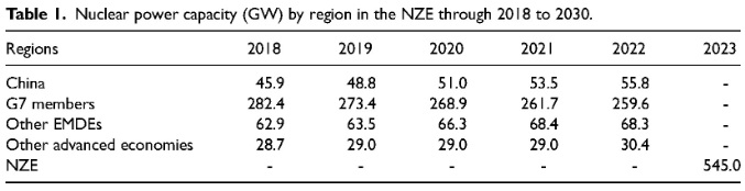 In 2022, global nuclear power capacity experienced a modest increase of approximately 1.5 GW, reflecting a marginal year-on-year growth of 0.3%. This expansion was primarily driven by new capacity additions that surpassed the retirement of an over 6 GW of existing capacity (Fernández-Arias et al., 2023; Mendelevitch et al., 2018). EMDEs accounted for approximately 60% of the new capacity additions, underscoring their increasing significance in the global nuclear energy landscape. Conversely, more than half of the retirements were observed in advanced economies, including Belgium, the United Kingdom, and the United States. Table 1 shows the nuclear power capacity by region in the NZE from 2018 to 2030.