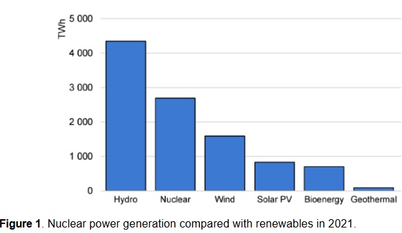 In 2020, nuclear power will constitute approximately 10% of the global electricity generation portfolio. This proportion, which had previously stood at 18% during the late 1990s, has experienced a decline; nonetheless, nuclear energy retains its status as the second-largest provider of low-emission electricity, trailing only hydroelectricity, and serves as the primary source within advanced economies. Despite the substantial proliferation of wind and solar PV technologies, nuclear electricity production in 2020 surpassed the aggregate output of these renewable sources. As of 2021, the global cumulative installed nuclear capacity has reached 413 GW, with 270 GW of this total being installed in advanced economies (Guidi et al., 2023; Halkos and Zisiadou, 2023; Pan et al., 2023; Zhang et al., 2022). Nuclear power generation during this period amounted to 2653 TWh, positioning it as the second largest source of electricity generation after hydropower, which generated 4275 TWh, as depicted in Figure 1.