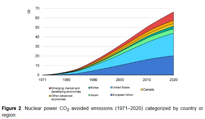 In addition to its significant role in power generation, nuclear energy plays a crucial role in mitigating carbon dioxide (CO2) emissions. Since the 1970s, nuclear power has helped avoid the global release of approximately 66 gigatons (Gt) of CO2 globally, as shown in Figure 2.