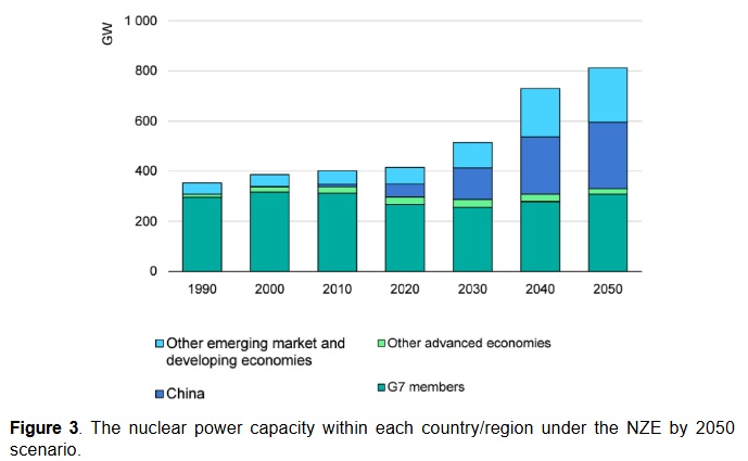 Nuclear power plays a substantial role within a secure global trajectory toward achieving net zero emissions (NZE) (Addo et al., 2023; Dafnomilis et al., 2023). Nuclear power capacity experiences a twofold increase, progressing from 413 GW at the outset of 2022 to 812 GW by 2050 within the NZE paradigm. It is apparent that the annual additions to nuclear capacity peaked at 27 GW per year during the 2030s, surpassing the levels observed in the preceding decade. Despite these advancements, the global proportion of nuclear power within the overall electricity generation portfolio has experienced a marginal decline, settling at 8% (Murphy et al., 2023; Ruhnau et al., 2023). Emerging and developing economies (EMDEs) substantially dominate global growth, constituting over 90% of the aggregate, with China poised to ascend as a preeminent nuclear power producer prior to 2030. Concurrently, advanced economies collectively witness a 10% augmentation in nuclear power capacity as retirements are counterbalanced by the commissioning of new facilities, predominantly observed in nations such as the United States, France, the United Kingdom, and Canada (Bórawski et al., 2024). Furthermore, annual global investment in nuclear power has experienced a notable escalation, soaring from US$30 billion throughout the 2010s to surpass US$100 billion by 2030, maintaining a robust trajectory above US$80 billion by 2050 (IEA, 2022).