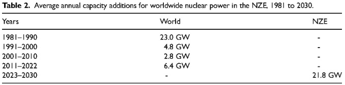 The expected growth in nuclear power capacity far exceeds the path outlined by the current policies and legal frameworks. According to the Stated Policies Scenario (STEPS), the nuclear capacity is projected to reach approximately 530 GW by 2050, which is 35% lower than that of the NZE pathway (Espín et al., 2023; Nicolau et al., 2023; Nnabuife et al., 2023; Wang et al., 2023). Without a significant shift from recent nuclear power development trends, achieving NZE would require a limited reliance on a smaller range of low-emission technologies. This could compromise energy security and lead to higher total investment costs, resulting in increased electricity prices for consumers. Table 2 shows the average annual capacity addition for global nuclear power in NZE from 1981 to 2030.