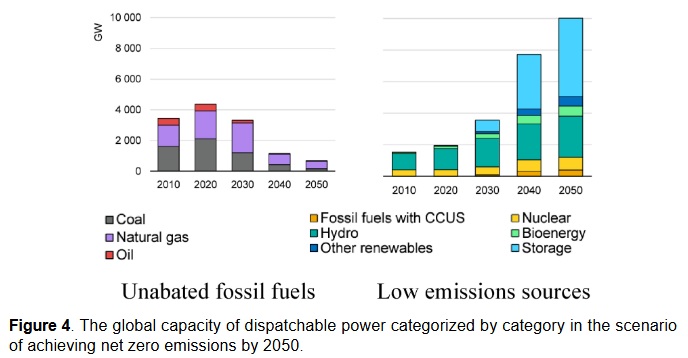 Conversely, the unabated natural gas-fired power capacity exhibits a sustained level of stability until 2030, primarily driven by the necessity to offset the diminishing role of coal; nonetheless, it subsequently undergoes a rapid descent throughout the 2030s. Oil, constituting a comparatively minor contributor, experiences rapid phasing out across most regions, except for remote locales, within the delineated scenario (Makarov et al., 2023; Ren et al., 2024). Figure 4 highlights the global capacity of dispatchable power categorized by category in the scenario of achieving NZE by 2050.