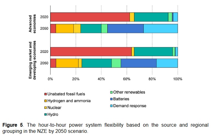 In this context, fossil fuels equipped with Carbon Capture, Utilization, and Storage (CCUS) technology have emerged as notable contributors to bolstering system adequacy. Yet, nuclear power remains a steady contributor to the power system flexibility. In advanced economies, the proportion of hour-to-hour flexibility is projected to increase from approximately 2% to 5% by 2050. Similarly, in EMDEs, this ratio is anticipated to increase from 1% to 3% over the same temporal span (Jenkins et al., 2018). It is worth highlighting that in France, where nuclear power fulfills the lion's share of electricity generation requisites, flexibility has been ingrained within reactor designs (Ho et al., 2019). This feature enables certain plants to swiftly modulate their output to align with the fluctuating electricity supply and demand, operating in a load-following mode (Chen, 2024; Jin and Bae, 2023; Kanugrahan and Hakam, 2023). Although many nations have not habitually engaged nuclear power in such operational dynamics, a considerable number of reactors are capable of performing load-following operations with minimal or no requisite technical adaptations (Caciuffo et al., 2020). Figure 5 demonstrates the hour-to-hour power system flexibility based on the source and regional grouping in the NZE by the 2050 scenario.