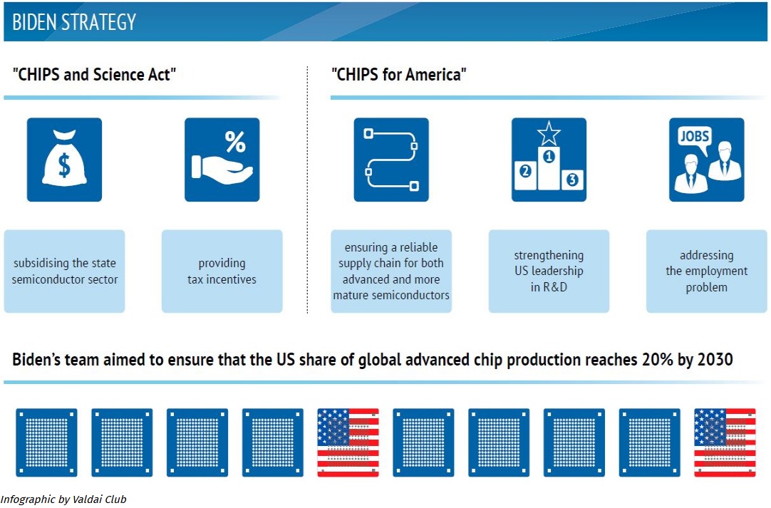 The Biden administration continued Trump’s push to revitalise the semiconductor industry. In August 2022, the CHIPS and Science Act was passed, allocating about $53 billion in government subsidies for the semiconductor sector, along with tax incentives to encourage both foreign and domestic firms to establish chip manufacturing operations on US soil. Additionally, the CHIPS for America programme was introduced to address several key goals, namely, to secure a stable supply chain for both cutting-edge and legacy semiconductors, to reinforce US leadership in R&D, and to boost employment, as investment in the chip industry was expected to generate hundreds of thousands of new jobs in microelectronics-related fields.