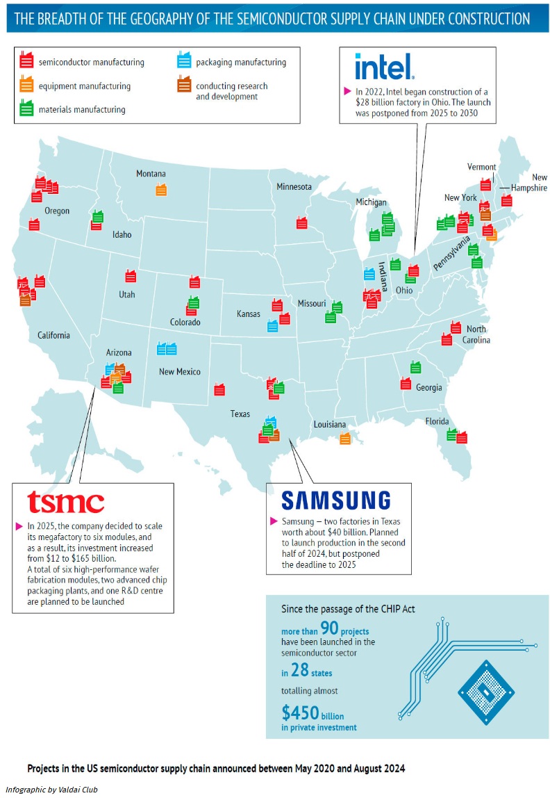 During Donald Trump’s first presidential term, the decision was made to attract leading chip manufacturers—most notably Taiwan Semiconductor Manufacturing Company (TSMC), the world’s largest contract chipmaker—to set up operations in the United States. This initiative proved successful: in 2020, TSMC agreed to invest $12 billion to build a chip fabrication plant in Arizona (Fab 21).