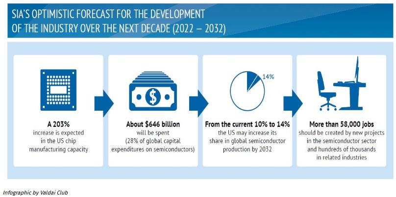 In this way, Trump’s initiative to revive the semiconductor industry has not only continued under Biden, but evolved into a more ambitious and costly programme. The SIA, in its above report, painted an optimistic picture for the future of the US semiconductor sector. It projects that chip manufacturing capacity in the United States will triple over the next decade (2022–2032), growing by 203 percent. This expansion is expected to require $646 billion in investment, or 28 percent of global capital spending in the semiconductor industry. As a result, the United States could increase its share of global chip production from the current 10 percent to 14 percent by 2032. Additionally, experts estimate that the new projects will create over 58,000 new jobs in the semiconductor sector and hundreds of thousands more in related industries.