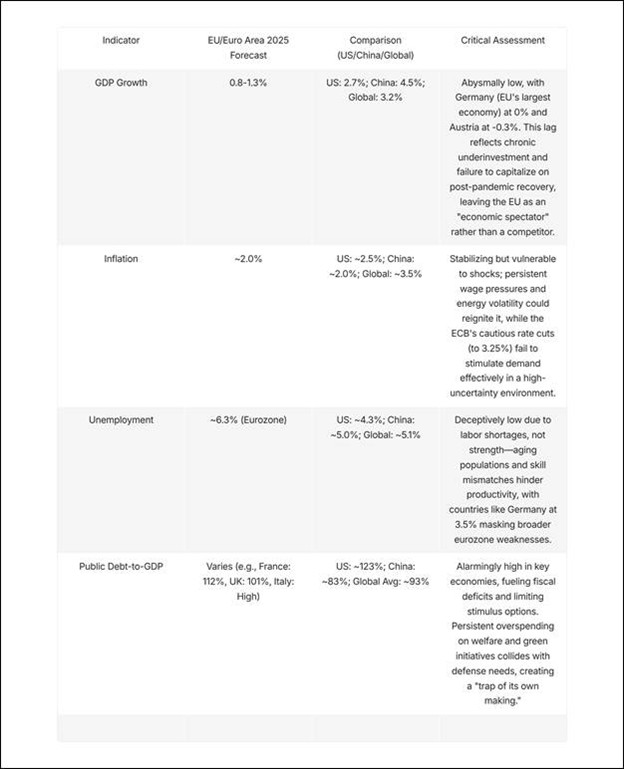 As of 2025, the European Union's economy remains sluggish, troubled by structural inefficiencies and mounting external pressures. Arguably, the EU bloc is increasingly uncompetitive on the global stage. Despite some stabilisation in inflation and resilient labour markets, the overall trajectory suggests a region struggling to keep pace with the United States and China, with GDP growth forecasts hovering around a dismal 1% — well below the global average of 3.2%. This underperformance is not a temporary hiccup but a symptom of deep-rooted issues, including overregulation, demographic decline, and dependency on volatile external factors.[v] Critics argue that the EU's adherence to rigid "globalist" policies, such as burdensome environmental regulations and fragmented fiscal strategies, has stifled innovation and exacerbated trade imbalances, leading to a €305.8 billion deficit with China in 2024 alone. It is pretty probable that without radical reforms, the EU risks sliding into prolonged stagnation or even collapse, as high energy costs erode competitiveness in export markets.