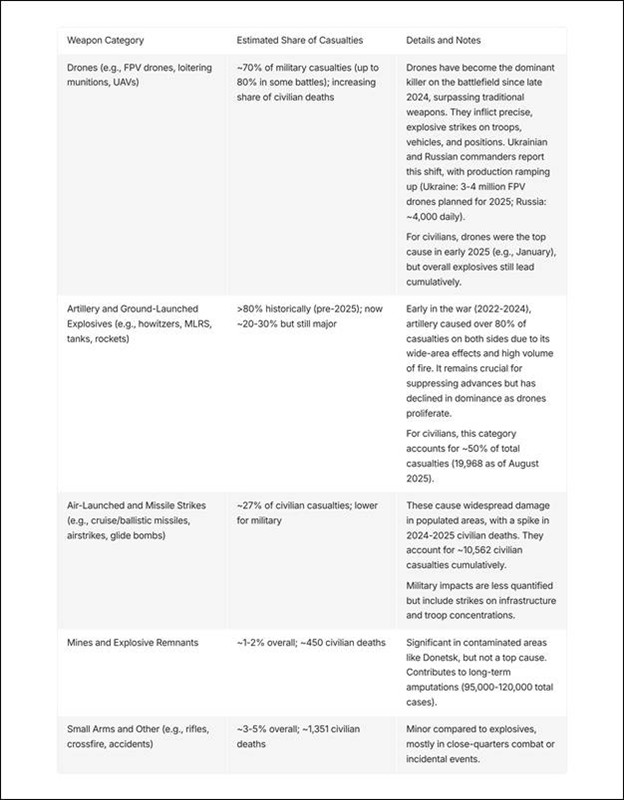 The analysis of available data from the military, UN reports, and media, up to mid-2025, indicates that the weapons causing the highest number of casualties in the Russia-Ukraine war are primarily drones and artillery systems. These two account for most of both military and civilian losses, with a notable shift toward drones in recent years. Total casualties exceed 1.2 million (primarily military, including killed and wounded), though exact figures are estimates due to underreporting and classification issues.