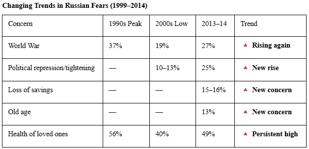 Este período de presión política y económica se reflejó en las inquietudes de la población rusa. Según una encuesta del Centro Levada de mayo de 2014, las principales preocupaciones de los rusos eran: enfermedad o muerte de familiares, pobreza o pérdida del empleo, guerra mundial, crimen, represión política, humillación pública y amenazas a la salud. Sin embargo, las tendencias de estos temores mostraron cambios notables en comparación con la década anterior (1999–2014).