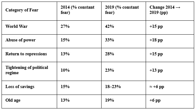 Cambio en los temores públicos (2014 vs 2019)Los datos del Centro Levada destacan cómo las preocupaciones de los rusos cambiaron entre 2014 y 2019. Ambos períodos muestran un aumento notable en los temores relacionados con la inestabilidad política y la represión gubernamental.