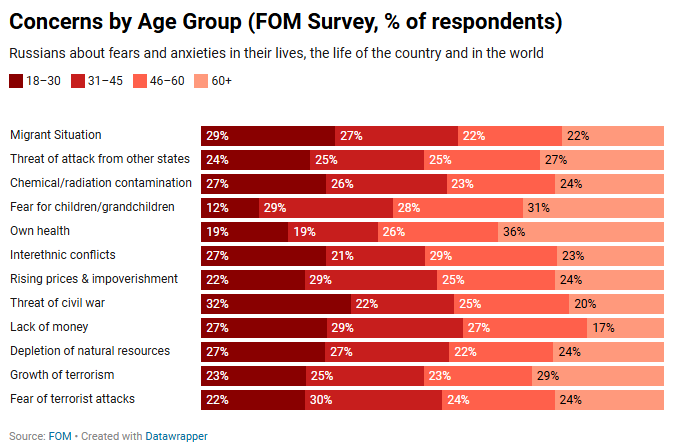 Datos recientes [1] revelan patrones generacionales distintos de miedo y ansiedad. Aunque la mayoría de los ciudadanos comparten preocupaciones sobre la seguridad, la estabilidad y el bienestar, la intensidad y el contenido de estos temores varían significativamente entre los diferentes grupos de edad. - Los jóvenes rusos (18–30 años) muestran los niveles más altos de ansiedad respecto a la inestabilidad política y la incertidumbre del futuro. Casi un tercio teme una guerra civil (32%), y una proporción similar expresa preocupación por la migración (29%) y las amenazas ambientales (27%). Estos temores reflejan su mayor sensibilidad ante el desorden social y las crisis globales, probablemente influenciada por el discurso político en línea. - Los grupos de mediana edad (31–60 años) tienden a concentrarse más en las presiones económicas y sociales. Las preocupaciones sobre el aumento de precios y el empobrecimiento (hasta 29%), los conflictos interétnicos (29%) y las amenazas terroristas (30%) dominan su visión del mundo. Esta generación, responsable del sustento familiar y el desarrollo profesional, parece ser la más afectada por la inflación, la desigualdad y la sensación generalizada de inseguridad en la vida cotidiana. - Los adultos mayores (60 años o más), en contraste, priorizan la salud personal y la seguridad familiar por encima de los temores políticos o económicos. Para este grupo, el enfoque cambia hacia lo personal e íntimo, pasando de las amenazas colectivas o nacionales a las vulnerabilidades propias del envejecimiento y el deterioro físico. Esta progresión — de ansiedades sistémicas a preocupaciones existenciales — sugiere que, a medida que las personas envejecen, sus temores se vuelven menos ideológicos y más vitales, reflejando la transformación general de la sociedad rusa.