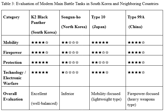 Este estudio ha examinado de manera sistemática la evolución y localización de los tanques de Corea del Sur, verificando su nivel de avance mediante comparaciones de desempeño con los principales competidores globales. En particular, el K2 ha demostrado capacidades equilibradas en movilidad, potencia de fuego, protección y mando y control electrónico, respaldadas por tecnologías avanzadas y un alto grado de producción local. Al mismo tiempo, ofrece una eficiencia de costos superior en términos de mantenimiento y gastos operativos, en comparación con los tanques principales de batalla (MBT) occidentales más pesados. Esto convierte al K2 no solo en un activo clave para fortalecer la defensa nacional, sino también en una plataforma competitiva y rentable dentro del mercado global de armamento. En conjunto, estos hallazgos sugieren que los tanques surcoreanos han superado el papel de ser simplemente un símbolo de defensa autosuficiente, y ahora están posicionados para expandir sus exportaciones y construir alianzas estratégicas a largo plazo en todo el mundo.