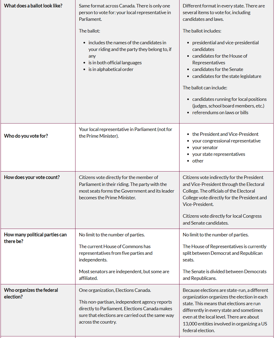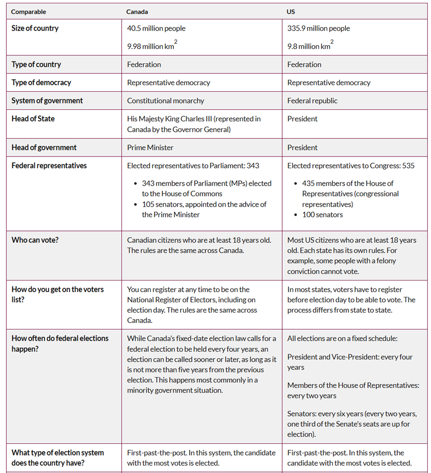 Table 5: Federal elections comparison II, US vs Canada (Elections Canada, 2025)