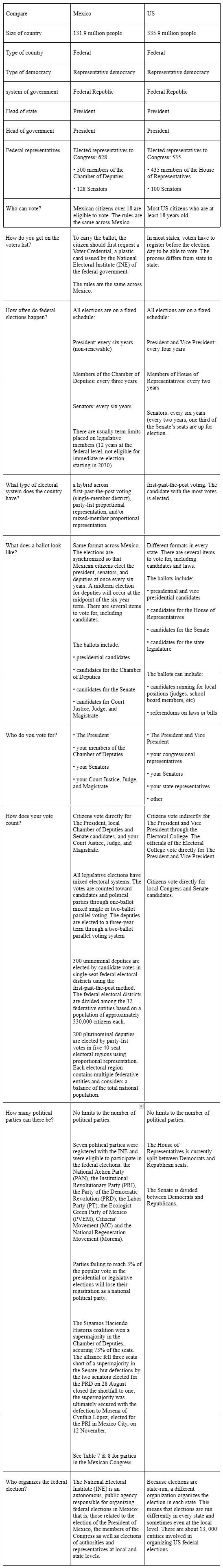 Table 6: Comparison of Federal elections, US vs Mexico (source: Wikipedia)