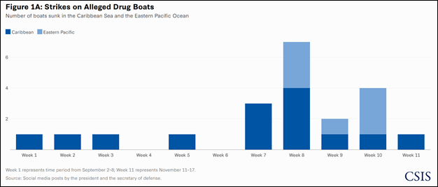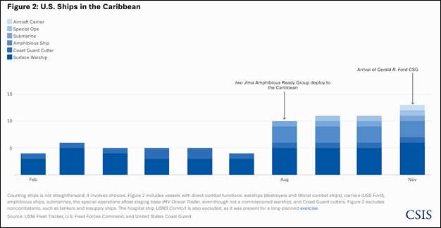 Reports suggest the strikes in the Caribbean have occurred near the Venezuelan coast. Previous analysis by the Centre for Strategic and International Studies (CSIS) described a potential U.S. surveillance operation off the coast, which the United States has purportedly established to detect and target potential drug traffickers before they integrate with the dense maritime traffic of the Caribbean.[15] Until late summer, the deployment of U.S. Navy ships to the Caribbean was relatively limited compared to previous years. However, as illustrated in Figure 2, this situation changed in August when the administration initiated a significant increase in forces to combat drug smuggling. Deployment levels further escalated with the arrival of the Gerald R. Ford Carrier Strike Group (CSG).[16]