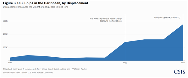 Recent deployments have also involved larger vessels, which bring substantial firepower and additional combat capabilities. A rudimentary method to quantify the enhancement in capability is to examine the displacement of the deployed ships. Figure 3 illustrates the significant increase in the displacement of deployed ships since the commencement of the second Trump administration. The initial major increase occurred with the deployment of the Iwo Jima Amphibious Ready Group; the arrival of the Ford CSG nearly doubled the number.[17]