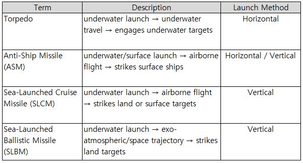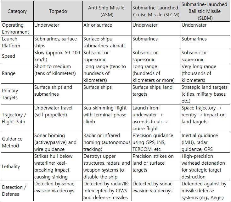 2.3.1. Launch WeaponsLaunch weapons are categorized as follows: - Torpedoes: Underwater weapons fired from a submarine’s horizontal launch tubes, used to attack underwater targets such as other submarines, surface ships, and mines. - Missiles: This includes anti-ship missiles (ASM) and sea-launched cruise missiles (SLCM) designed to strike surface or land targets. Some missiles are launched through Vertical Launch Systems (VLS). - Nuclear Weapons: The primary example is the SLBM (Sea-Launched Ballistic Missile), equipped with a nuclear warhead. These form the core of a nation’s strategic nuclear deterrence capability.