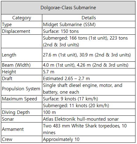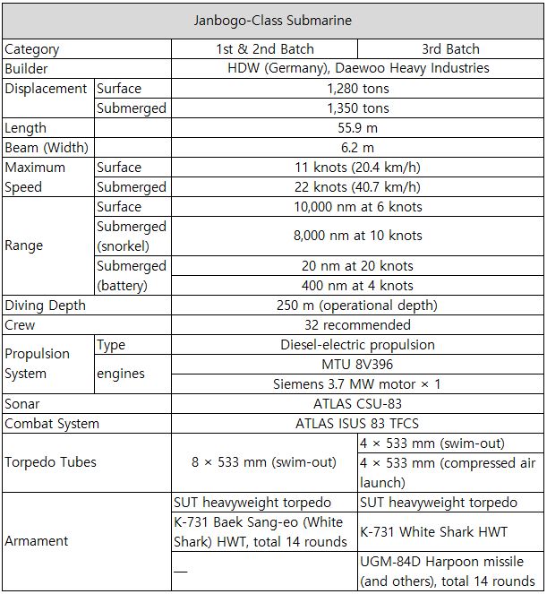 Table 4. Specifications of the Dolphin-class Submarines (Source: Namuwiki)
