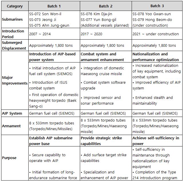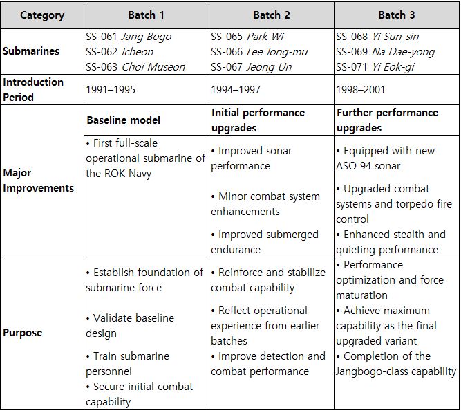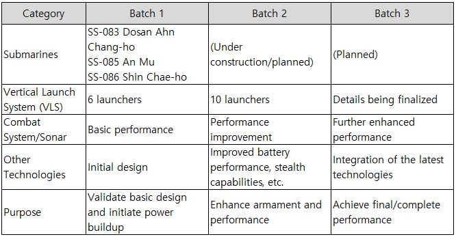 Table 5. Specifications of the Jangbogo-class Submarine (Source: Namuwiki). Note: A batch refers to a group of submarines of the same model built in series, with incremental performance improvements applied in each production run.