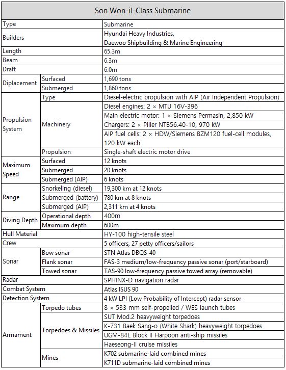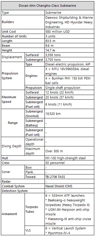 Table 9. Specifications of the Dosan Ahn Chang-ho Class Submarine (Source: Namuwiki)