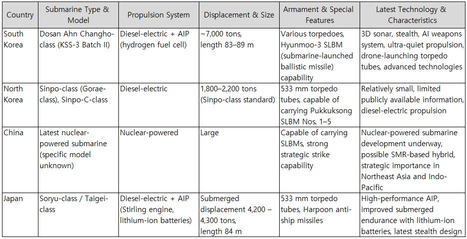 Military Ranking: Evaluated as top-tier in Asia in the order of China > Japan > South Korea > North Korea. • Advanced Technology: Japan, South Korea, and China are rapidly advancing in technological innovation, while North Korea focuses on strategic threat capabilities. • Operational Capability: Japan and South Korea excel in maritime route defense and blockade capabilities, whereas China’s strength lies in ocean-going and strategic power projection. Asian military experts particularly regard South Korea’s KSS-III, Japan’s Soryu-class/Taigei-class, and China’s latest submarines as the pinnacle of their respective national defense technologies. North Korea, while still relatively underdeveloped, raises the threat level through the public display of its strategic nuclear-powered capabilities.