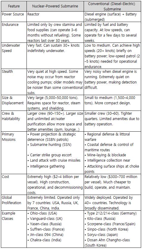 Despite the enormous cost gap shown earlier, the South Korean government has strong reasons for wanting to acquire nuclear-powered submarines. These reasons are rooted in national security, strategic autonomy, and enhanced maritime defense capability. Key strategic motivations include: 1) Responding to North Korea’s SLBM Threat North Korea: Developing the Sinpo-class SSBN (armed with SLBMs). If a North Korean SLBM submarine hides in the deep waters of the East Sea, it becomes impossible to track with conventional submarines. Only nuclear-powered submarines can conduct continuous 24-hour tracking due to their unlimited underwater endurance 2) Monitoring Chinese Submarine Activity: China has ~12 nuclear submarines + ~50 diesel-electric submarines and is increasing activity in the East China Sea and Western Pacific. To monitor Chinese submarines operating in the open ocean, nuclear-powered submarines are essential 3) Strengthening Strategic Deterrence: Current South Korean SLBM range: ~500 km, requiring operations near the Korean Peninsula. A nuclear submarine can launch from anywhere in the Pacific, drastically expanding deterrence. Provides a “survivable second-strike capability”—a retaliatory force that cannot be located or neutralized 4) National Prestige: Nations that operate nuclear submarines are considered major military powers. Only six countries currently possess them. Strengthens technological sovereignty and diplomatic leverage South Korea’s desire to operate nuclear-powered submarines is driven by strategic and security needs that far outweigh cost considerations. For over 30 years, South Korea has pursued nuclear submarine capabilities as part of a long-term defense strategy, aiming to achieve: enhanced nuclear deterrence, increased strategic autonomy, breakthroughs in defense technology, effective countermeasures against the expanding submarine forces of North Korea and China. Nuclear-powered submarines are seen as essential platforms capable of long-duration, high-speed, and highly covert operations—capabilities that are crucial in Korea’s security environment.