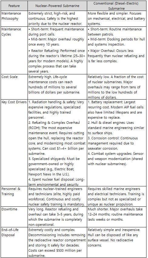 8.2. Maintenance Comparison Between Nuclear-Powered and Conventional SubmarinesWhich force should a nation prioritize: Nuclear submarines, the backbone of strategic deterrence thanks to their unlimited underwater endurance, or conventional submarines, which offer excellent cost-effectiveness and are easier to field in larger numbers? One of the core factors in this decision is operational cost-efficiency. Beyond construction cost, the long-term burden of decades of maintenance, training, reactor refueling, and life-cycle logistics must be considered. The comparison below outlines these sustainment requirements.