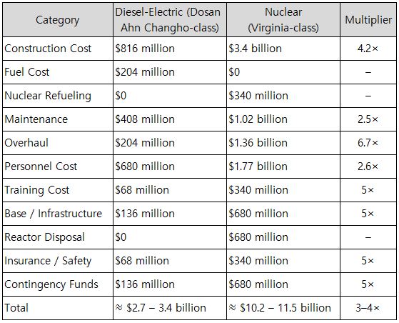 Let us compare two submarines of similar class size as examples: • Dosan Ahn Changho–class (KSS-III, South Korea) — conventional (diesel-electric + AIP) • Virginia-class (SSN, United States) — nuclear-powered Between these two types, the Total Lifetime Cost is 3 to 4 times higher for the nuclear-powered submarine. Below, we analyze the causes of this massive cost difference using concrete figures.