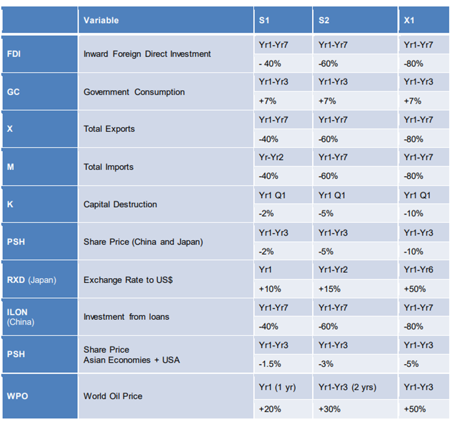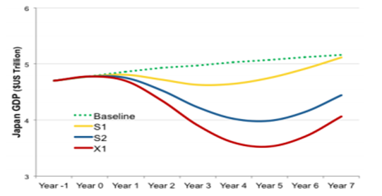 Inward foreign direct investment is investment in business and capital. China has significant inflows of foreign direct investment and is therefore much more affected by a conflict shock to this variable than Japan. A 40% reduction of inward foreign direct investment represents a loss of approximately US$ 100 billion per year to the Chinese economy at its peak in year 2. In Japan, this represents a loss of about US$ 2.1 billion per year at its peak in year 2. Government consumption increases during the conflict to pay for military, ammunition and additional resources required for conflict. China spent 2% (US$ 166 billion) of GDP on defense in 2014, while Japan spent 1% (US$ 59.3 billion) of GDP on defense. In each of the three scenarios, government spending increased 7% in the first year and then returned to baseline levels by the end of the second year. This represents an increase in government spending of US$ 86 billion per year for China and US$ 70 billion per year for Japan. Exports and imports account for a significant share of GDP for both Japan and China. In China, exports account for 26% of GDP and in Japan, exports account for 18%. One of the largest economic effects that will occur as a result of this conflict will result from exports and imports being prevented to entering the East China Sea. Exports and imports are both shocked simultaneously and equally in each scenario. The peak of the shock to exports and imports occurs at the outbreak of conflict but takes a further six years to recover to pre-conflict levels. Capital destruction is defined as capital that can no longer be used as a productive resource and is an expected but unfortunate consequence of conflict. A declining capital base therefore has very serious consequences for economic growth and output. The level of capital destruction increases in each of the three scenarios from 2% of the capital stock in S1, 5% in S2 and 10% in X1. Share (stock) prices capture the market valuation of firms within an economy and incorporate the assets into a firm’s books and the expected value of future revenue and profit. Share prices therefore capture the level of confidence that the market has in the future profitability of a firm. Any firm that operates in a country that is in conflict will face increasing risks to its normal business operation and long-term strategic objectives. Increased uncertainty about future growth will have significant downward pressure on the market valuation of firms that operate in these areas. Share prices have been shocked 2% in S1, 5% in S2 and 10% in S3 compared to the baseline. Share prices are also expected to decline in other parts of the world as future global expectations are amended downward. These effects are modeled directly on neighboring Asian countries and the US stock market. In all three scenarios, however, share prices return to baseline by the end of second year after the conflict began. Capital flight occurs when assets and money rapidly move out of a country or region. Capital flight is most likely to occur when investment and business outlooks are uncertain, and investments are placed at risk. In Japan, capital flight is modeled as a devaluation of its exchange rate benchmarked against the US dollar. A 10% devaluation of the Japanese currency takes place in S1, 15% in S2 and 50% in X1. Modeling capital flight from China is more problematic. China has strict controls on capital, and the Yuan does not float on international currency markets. As a result, the exchange rate in China is fixed at present levels across all scenarios. Capital flight from China is therefore indirectly captured through a decline in investment funded by loans. This is represented by a shock of 40% in S1, 60% in S2 and 80% in X1 with recovery back to baseline projections taking six years. World oil prices typically rise during conflict due to increased demand for energy and heightened uncertainty around supply. This is modeled as a 20% increase in S1, 30% increase in S2 and 50% increase X1. The rise in oil prices lasts for 12 months during the conflict and then is allowed to return to base during the second year.