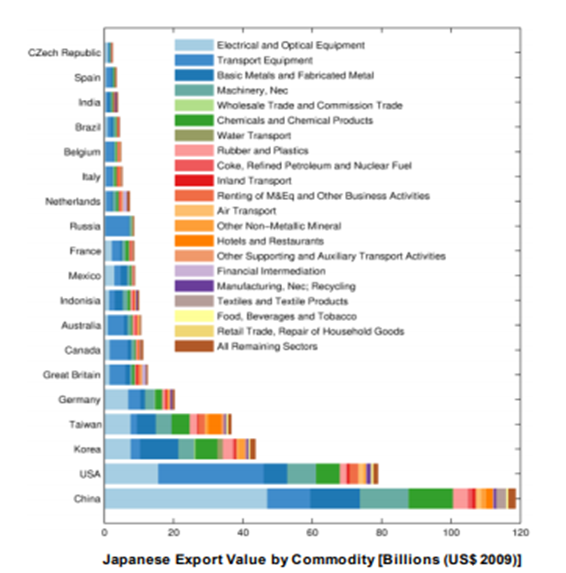 Impact of China-Japan conflict on exports and importsA shock on exports and imports to Japan and China represents one of the most significant effects that will affect global economic output. Figures 1 and 2 show the international exports from Japan and China which are halted by the conflict. The biggest recipient of exports from Japan and China, apart from each other, is the US.