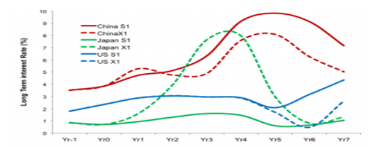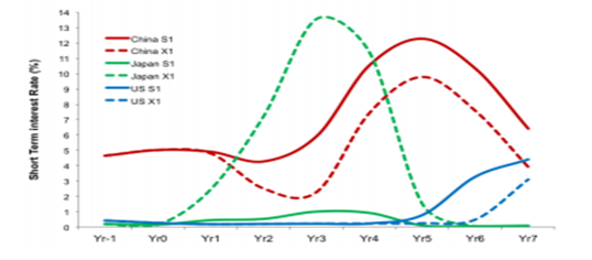 Exchange rates represent the relative value of a nation’s currency and are closely correlated with a nation’s interest rates. In the scenario, Japanese exchange rates are free to adjust on currency markets, reflecting relative value of the Japanese Yen, while China controls its currency on international markets, depressing the value of the Yuan to favor its own exports. This different policy approaches to currency will result in different impacts on interest rates in both countries. In China, where exchange rates are fixed during the modeling period, short-term interest rates experience the highest increase in scenario S1, reaching a peak at a little over 12%. Because the Yuan is fixed and not allowed to devalue, the major forces acting on interest rates are dominated by inflation and the money supply. In Japan, where exchange rates are allowed to fluctuate on international markets, high interest rates are caused by an increase on the risk premium of US denominated debt and the lagged effects of the exchange rates affecting investment and consumption. In Japan, therefore, the highest interest rates will occur in scenario X1.