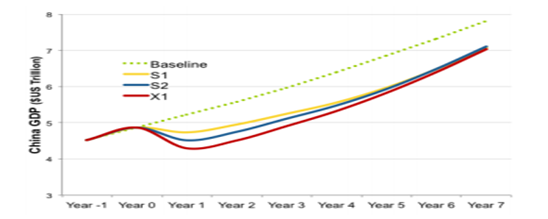 Impact of China-Japan conflict on productivity and growthIn all scenarios, both Japan and China go into recession in the first year of the conflict, year 1. In China, the recession lasts approximately 12 months, with negative growth reaching a peak at -10% in scenario X1 (see Figure 6).