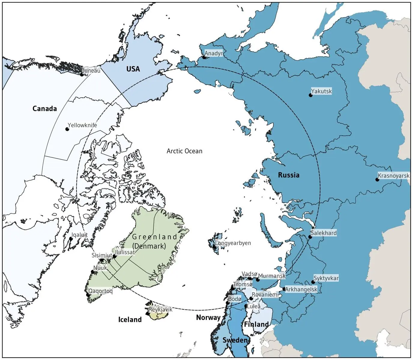 Figure 1: Arctic states, counties and other administrative regions with capitals. Source: Map by Arto Vitikka, Arctic Centre, University of Lapland. Credit for the border data: Runfola, D. et al. (2020) geoBoundaries: A global database of political administrative boundaries. PLoS ONE 15(4): e0231866. https://doi.org/10.1371/journal.pone.0231866e.