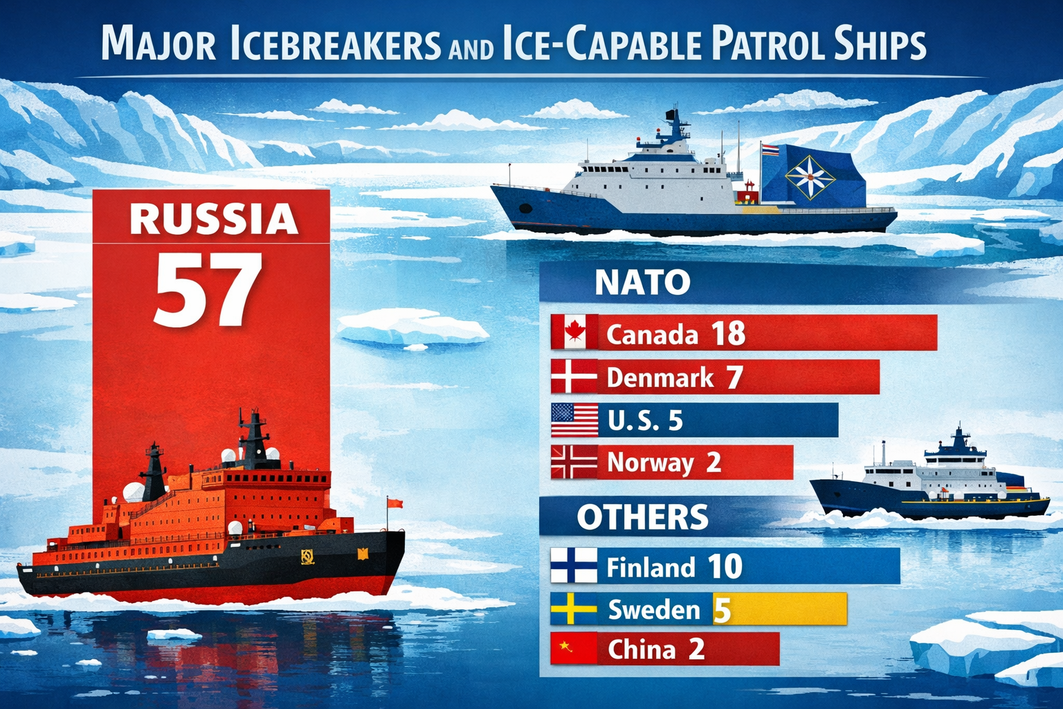 The transit in the Arctic can be defined by the possibility to move freely without any inconvenience due its extreme conditions – or at least with the least inconveniences. In consequence major ice breakers and ice-capable patrol ships became very important assets for the countries in the region. In a simple comparison, Russia possesses more icebreakers than NATO combined, as shown in Figure 5, including nuclear-powered vessels capable of year-round Arctic operations. These ships are instruments of sovereignty, enabling continuous military presence, escort of commercial shipping, enforcement of Arctic regulations and rapid crisis responses. By contrast, the United States has long underinvested in icebreaking capacity. NATO relies on a patchwork of national fleets, with Finland and Sweden contributing significantly but still lagging behind Russia’s scale. The strategic implication is clear: Russia controls mobility while NATO controls nodes. In such an environment, fixed strategic anchors like Greenland become even more critical.