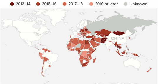 The United States has employed different geopolitical strategies to maintain its status as a dominant power vis-à-vis rival countries such as China and to achieve its foreign policy objectives. Since his return to the White House, President Donald Trump has announced tariff increases on 60 countries, issued ultimatums to Russia to end the War in Ukraine, and recently intervened in Venezuela by capturing Nicolás Maduro. In this way, a rise in the use of hard power by the United States can be observed, aimed at forcing other countries to behave in a particular manner in order to achieve its geopolitical objectives. The foreign policy process of a state is the most important means through which it formulates and implements the policies that determine its interactions with other actors in the international system. Hans Morgenthau (1949) argued that self-preservation is the primary duty of a nation; in this regard, the choice of foreign policy objectives and means is predetermined in two ways: by the goals to be pursued and by the power available to achieve them. For his part, Joseph Nye (1999) argued that a state’s interests are not revealed solely through power or security considerations, since they also include economic concerns. Thus, countries also focus on economic relations, which may entail interdependence effects among states. Consequently, both national security and economic well-being are important to states’ interests. Within this framework, it is possible to discern the geopolitical landscape that the United States is developing through its foreign policy. Secretary of State Marco Rubio stated that they would not allow the Western Hemisphere to become a base of operations for adversaries, competitors, and rivals of the United States. “This is our hemisphere,” he affirmed, “and President Trump will not allow our security to be threatened” (The White House, 2026). This warning, together with the National Security Strategy and the recent intervention in Venezuela, represents a new form of the Monroe Doctrine. In his address to Congress in 1823, President James Monroe articulated the United States’ policy regarding the new political order that was developing in the Americas and Europe’s role in the Western Hemisphere. The Monroe administration warned the European imperial powers not to interfere in the affairs of the newly independent Latin American states. In this way, it sought to increase U.S. influence and trade throughout the southern region (Office of the Historian, n.d.). Likewise, the Trump administration’s geopolitical objective is to consolidate its hemisphere of influence in the face of rival powers, primarily China. Marco Rubio indicated that it is important to secure the national interest in the region and stated: “we have seen how our adversaries are exploiting and extracting resources from Africa. They are not going to do it in the Western Hemisphere” (The White House, 2026). In addition to Latin America, the United States has sought to increase its presence in Africa to counterbalance China. China’s main foreign policy strategy is the Belt and Road Initiative (BRI), launched by President Xi Jinping in 2013 with the aim of strengthening global connectivity through infrastructure initiatives such as roads, ports, and railways. As a result, China’s economic and political influence expanded by linking Asia, Europe, and Africa. By early 2025, more than 150 countries had joined the BRI, representing approximately 75% of the world’s population and more than half of global GDP. China’s Ministry of Commerce reported that the cumulative value of BRI investments and construction contracts has exceeded one trillion dollars across all participating countries (Ulubel, 2025). In Africa, one example of Belt and Road infrastructure is the Mombasa–Nairobi railway in Kenya, which was financed by Chinese banks under the framework of the agreements. As a result, more than 2 million passengers and around 6 million tons of goods are transported annually, allowing transportation costs to be reduced by 40%. In addition, the expansion of the line toward Uganda, Rwanda, and South Sudan is planned, with the aim of integrating the economies of East Africa into a common railway system (Ulubel, 2025). Figure 1 illustrates the countries that have partnered with the Belt and Road Initiative, by year of accession. The geographic areas where China is consolidating its presence can be observed, especially on the African continent.