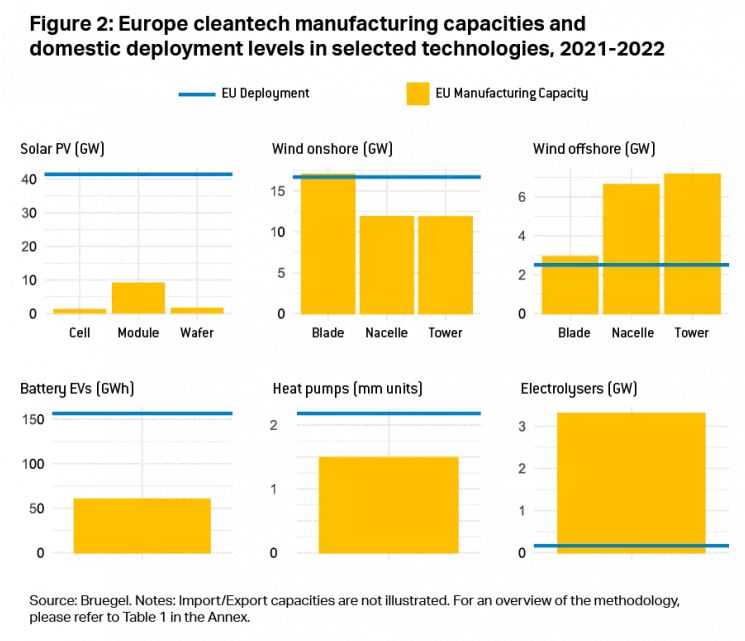 Para abordar esto, proporcionamos una descripción general de la capacidad de fabricación de tecnologías limpias actual de Europa y la comparamos con los niveles actuales de implementación de tecnologías limpias. Esta evaluación es útil por dos razones. En primer lugar, permite una mejor apreciación de la escala de las capacidades de fabricación de la UE. En segundo lugar, muestra que adoptar un objetivo de fabricación del 40% único para todos, como se propone en la NZIA, puede tener poco sentido considerando las situaciones muy diferentes de las diferentes tecnologías limpias.